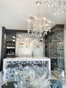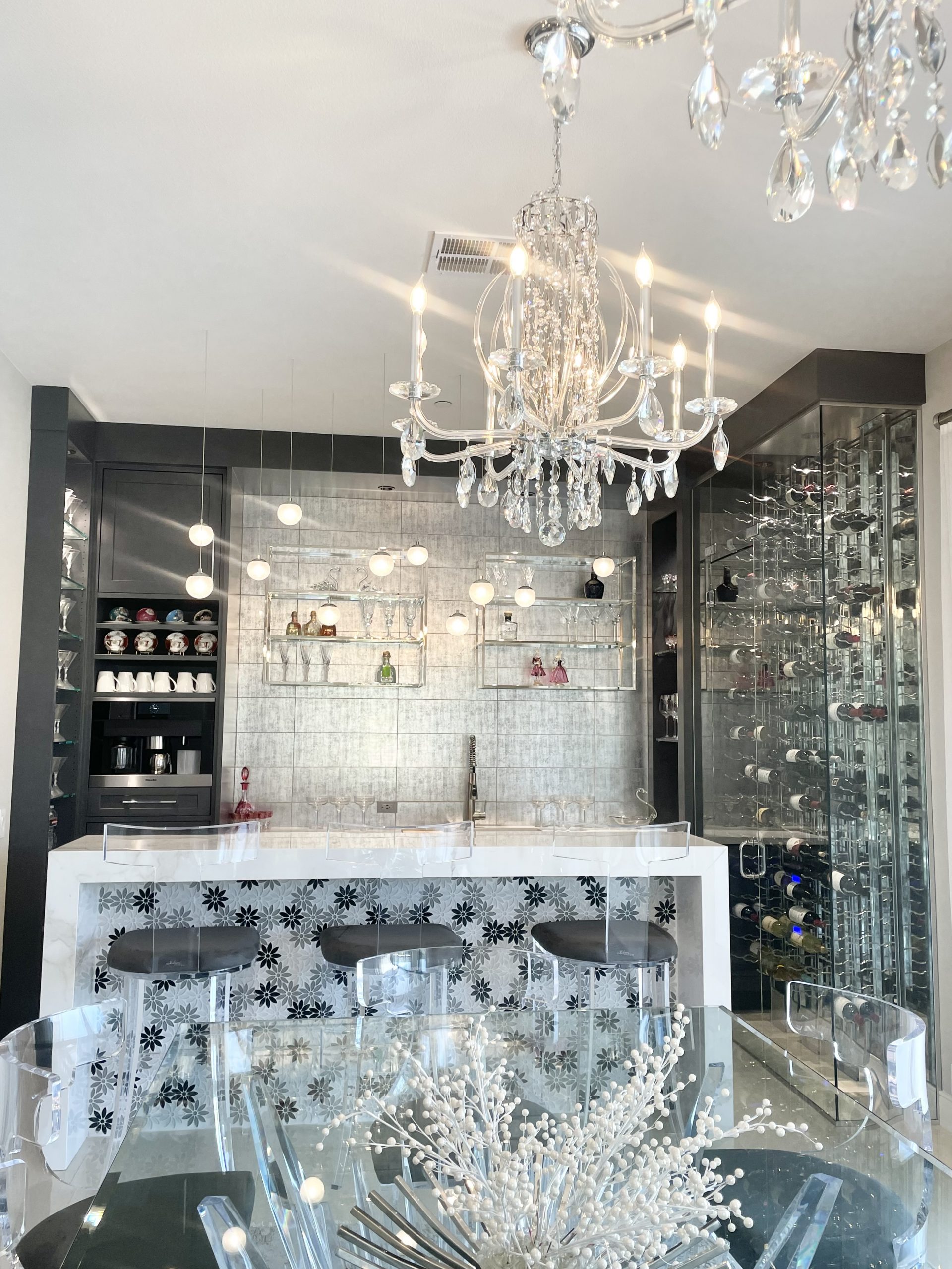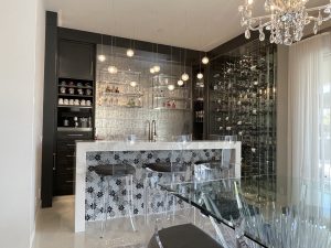 In 2022, we brought to life a vision of modern glamour in this Carmel Valley home. The bar’s design is a celebration of chic sophistication, featuring a sleek porcelain countertop paired with antique mirror tiles for an eye-catching backsplash. The bar’s shimmering allure is amplified by Simatic chrome shelves, which reflect the ambient lighting, and custom cabinets that meld form and function. A possible addition of a floating light would hover as a beacon of contemporary style, illuminating the bar’s polished surfaces and casting a warm glow over every glass raised in celebration.
