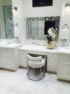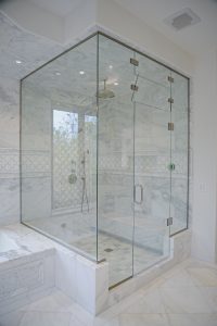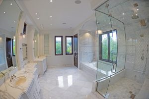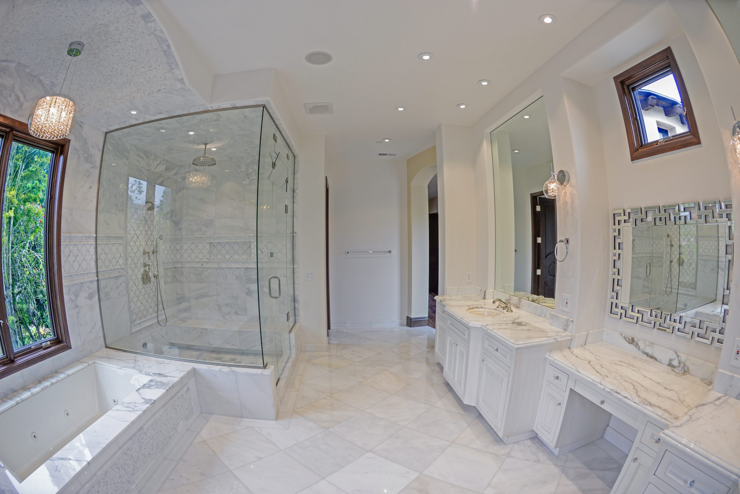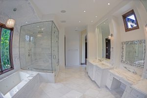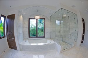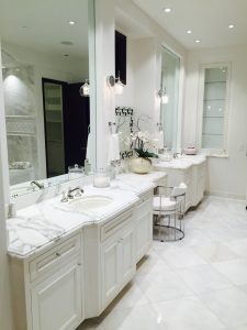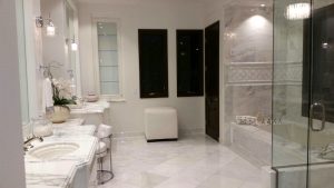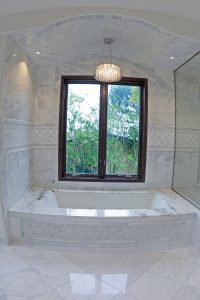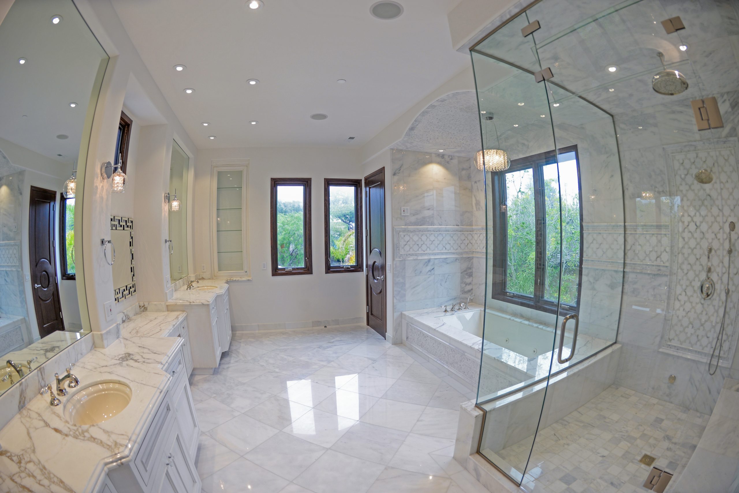 La Jolla Bathroom: A Vision in White Marble We completed a serene bathroom remodel in La Jolla, adorned entirely with white marble stone for a look of uninterrupted elegance. The sink countertop, crafted from the distinctively luxurious Calacatta stone, serves as a stunning focal point in this tranquil space.