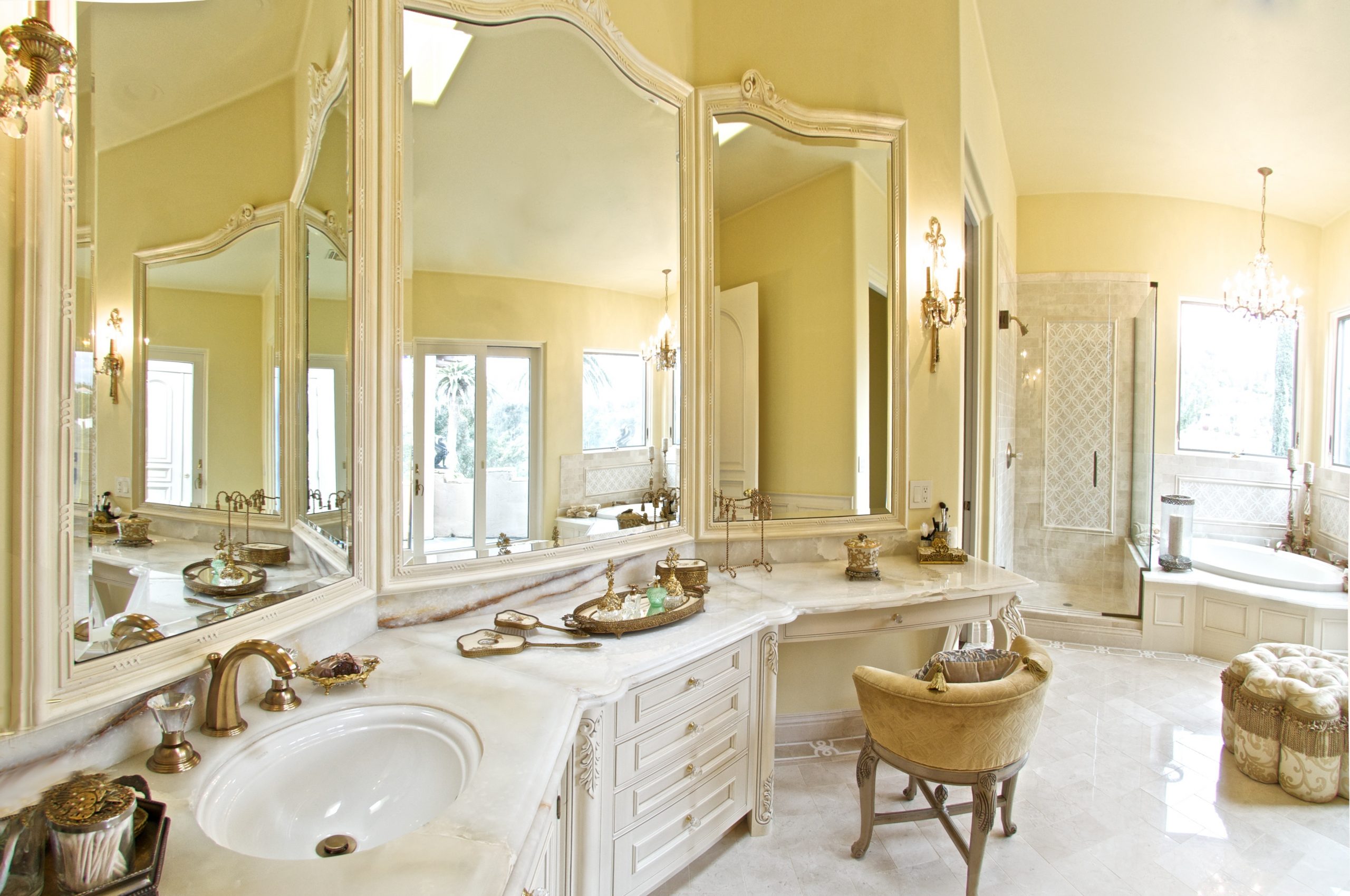This master bathroom in RSF underwent a complete redesign, transitioning from a traditional style to an exquisite Country French aesthetic. The remodel has distinct his and her areas, with the latter boasting an elegant Onyx countertop that adds a touch of luxury.