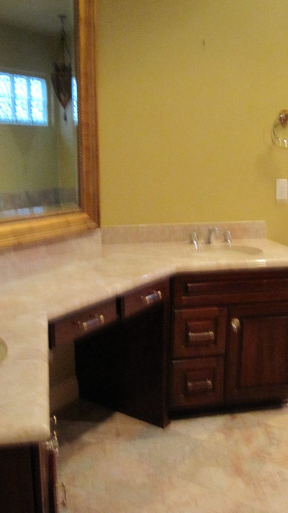 This master bathroom in RSF underwent a complete redesign, transitioning from a traditional style to an exquisite Country French aesthetic. The remodel has distinct his and her areas, with the latter boasting an elegant Onyx countertop that adds a touch of luxury.