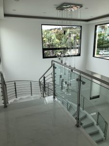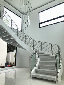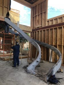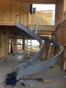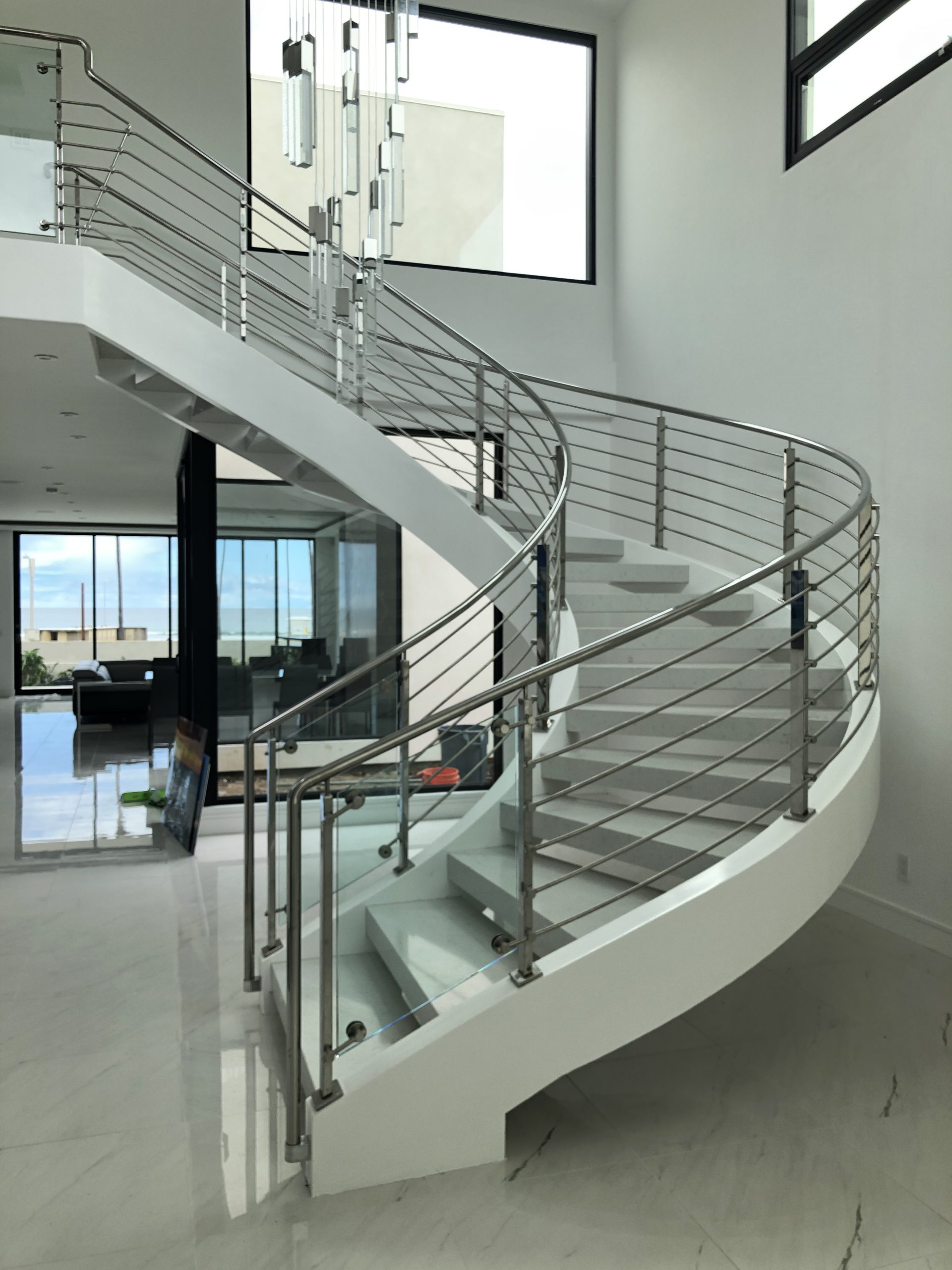 Artisanal Wrought Iron Staircase in La Jolla This exquisite La Jolla residence features a beautifully curved custom staircase, a testament to the artistry of wrought iron craftsmanship. The staircase is complemented by warm wood plank steps, adding a natural touch to the elegant, flowing design.